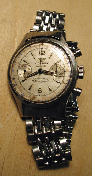 Hello, I have a Wittnauer Professional Chronograph given to me by my wife�s grandfather. We really don�t know that much about it and are interested in finding out what how old its and what it may be worth. We think it may be from the 40's but aren't really certain. It has the normal scratches you would associate with daily use but no real imperfections. All of the hands and dials function properly and it keeps accurate time, assuming I remmeber to wind it . I�m including a couple of pictures to hopefully give you a better idea as to what it looks like and it�s current condition.
