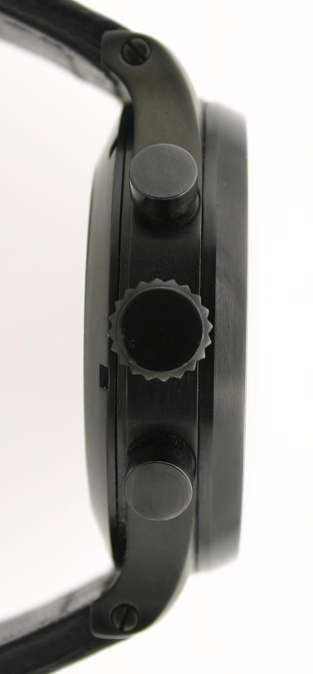 Huguenin Observer - New stainless steel, PVD coated 47mm case with screw back and domed crystal; water resistant to 5 atmospheres. Screw down crown and screwed in lug bars; thick, Italian leather band with screwed PVD buckle.