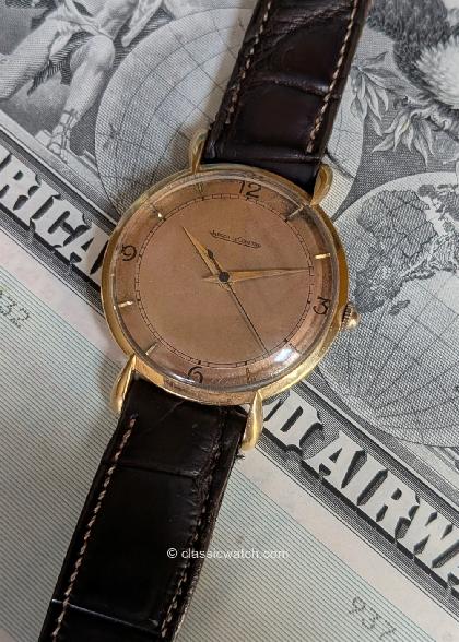 Classic oversized 18K yellow gold Jaeger-LeCoultre tear drop lugs case, patinated dial, circa 1946. If you want the vintage look, this is it. A bargain given the price of gold!. (Ref rx1543) $1,895 Ask Question How to Order Buy Now